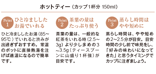 爽やかでみずみずしい風味が魅力のダージリン ファーストフラッシュ。すっきりと香り高いホットティーがおいしいのはもちろんのこと、やさしくまろやかな味わいに仕上がる水出しアイスティーもおすすめ。ホットとアイスで飲み比べてみると、それぞれ違った魅力を楽しむことができます。