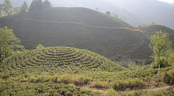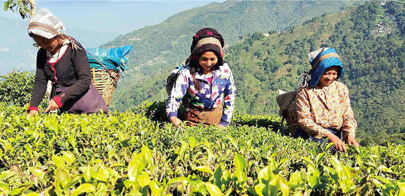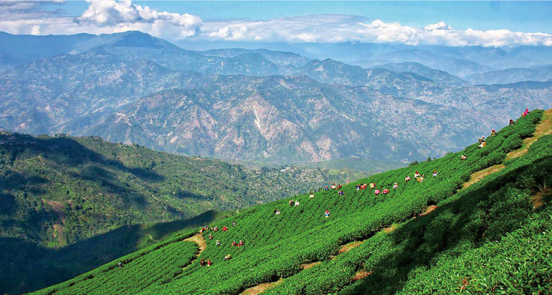 オータムナルの収穫を行うダージリン茶園。急斜面の中、丁寧に手摘みされます。