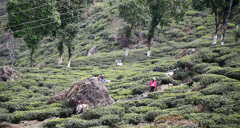 オータムナルの収穫を行うダージリン茶園。急斜面の中、丁寧に手摘みされます。