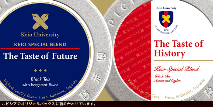 「学問のすゝめ」の著者・福澤諭吉が開校した、150年の歴史をもつ慶應義塾大学とルピシアがコラボレーション。大学をイメージしたオリジナルブレンドのお茶2種セットです。The Taste of History(写真・右)はアッサムとセイロンをブレンドし、福澤諭吉が好んだミルクにも良く合うコクのある深い味わいの紅茶です。The Taste of Future(写真・左)は爽やかなベルガモットで香りづけした紅茶に、慶應BRB(ブルー・レッド&ブルー)カラーをイメージした花びらを散りばめました。