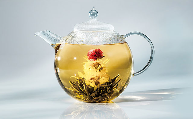 透明なポットに入れてお湯を注ぐと、ゆっくりとほどけ、内側に編み込まれた花がふわりと咲きます。