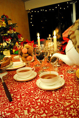 自分たちで飾ったもみの木や、テーブルセッティングも準備万端! おいしいお茶、おいしいお菓子も揃っています。