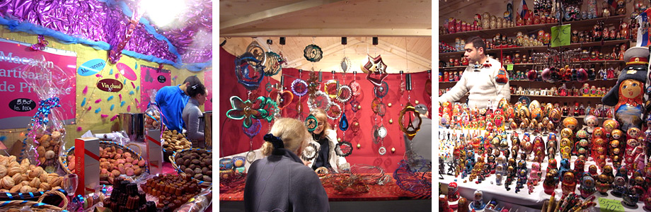 シャンゼリゼ通りのクリスマス市では、通りの4分の1くらいに、小さなお店がずらりと並んでます。チョコレート、クレープ、あめ、ホットドッグやお茶、アクセサリーやロシアのおもちゃなど多種多様です。ただ、私はもっと木製のおもちゃなど、クリスマスの飾り付けがたくさん売っているのかと思いましたが、意外と飲食ものが多く、ちょっと残念でした。