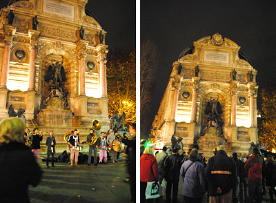 サン・ミッシェル(St. Michel)の噴水の前では、急に陽気な音楽ライブが始まりました。ここは、パリジャンたちの待ち合わせのメッカ。渋谷のハチ公です。極寒なのに、素手で楽器を弾く彼ら。すぐに人だかりが出来て、踊り出す人も出る始末。微笑ましい一幕でした。