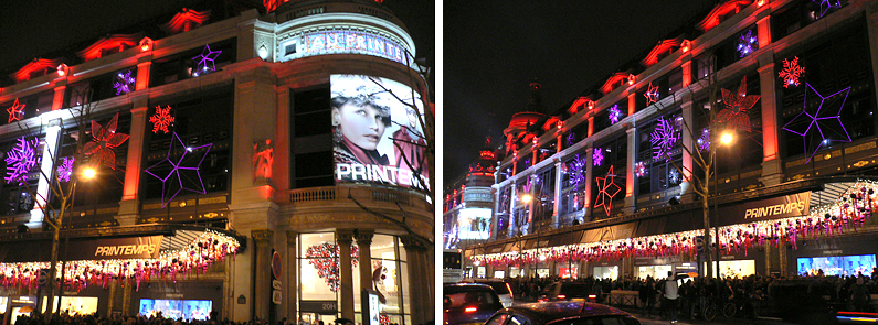 以前ご紹介したギャラリー・ラファイエットの向かいにある、こちらも老舗百貨店のプランタン(Printemps)。イルミネーションきれい。迫力があります。