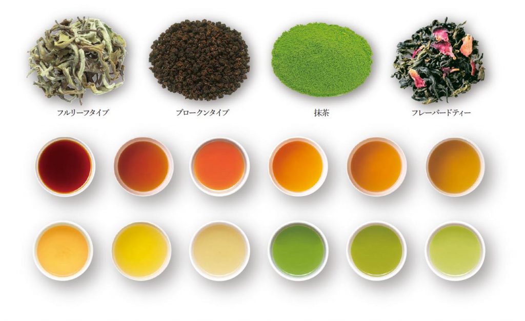 たとえば、葉の形を保ったまま乾燥させたフルリーフタイプと、細かく砕いて粒状に仕上げたブロークンタイプでは、同じお茶でも見た目がまったく異なります。台湾烏龍茶は丸い形状のものが一般的。茶葉を揉みながら丸めることで風味を閉じ込めています。抹茶の鮮やかな緑色は、日陰で栽培することで生まれます。また、フレーバードティーはトッピングで見た目も華やかなものも多く、その表情の豊かさに驚かされます。