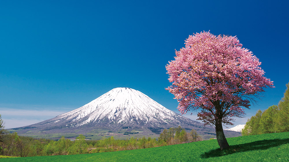 北海道京極町、望羊の丘の一本桜と羊蹄山