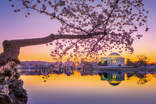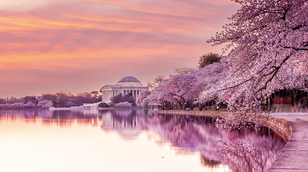 ワシントンのポトマック川沿いにある貯水池タイダル・ベイスンにも1912年に日本から贈られた桜が植樹されました。豊かな水をたたえたタイダル・ベイスン、満開の桜、遠くに立つ白亜のワシントン記念塔がつくりだす風景は春を告げる名シーンです。