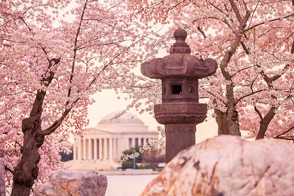 桜が咲く季節、ワシントンD.C.では全米最大級の春のイベント「全米桜祭り」が開催されます。この祭りは、タイダル・ベイスンに設置されている石灯籠に灯を入れるセレモニーからスタートします。徳川三代将軍家光ゆかりのものと伝えられるこの灯籠は、年に一度、祭り期間だけ灯がともされるのだそうです。